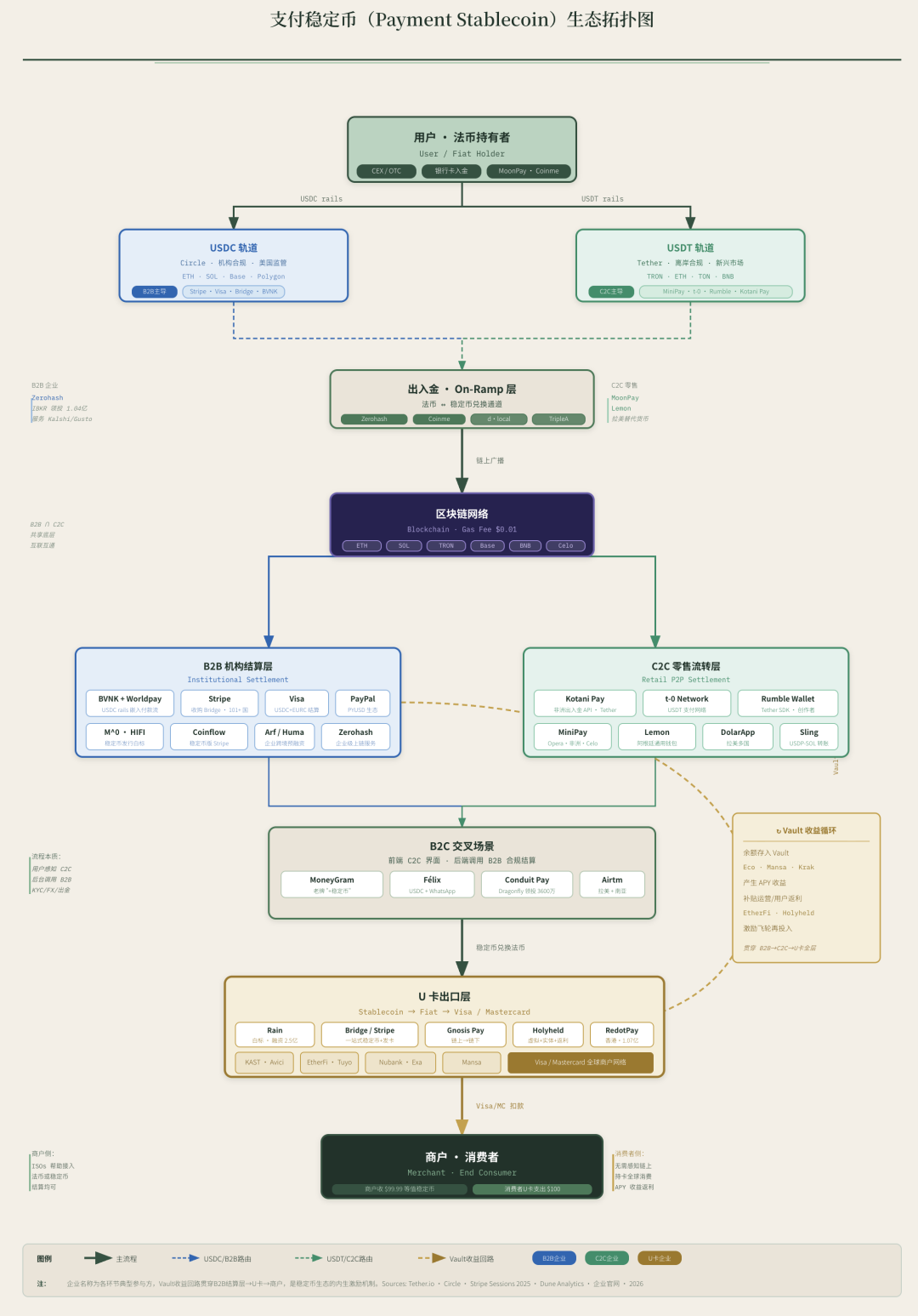 有待取得共识之处,在于要不要彻底取代银行,以及支付稳定币如何从 C2C/B2B 的二分下包围 B2C 业务。