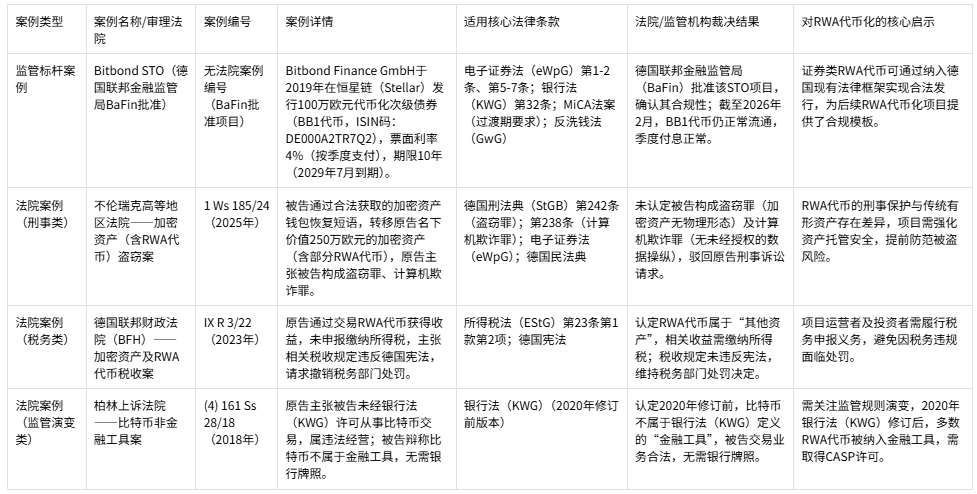 注:表格中所有案例均来自德国法院官方判决、德国联邦金融监管局(BaFin)公开信息及参考文档,来源可追溯,为理解德国RWA代币化法律应用提供实操指引。