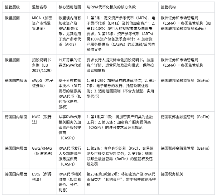 注:该表格汇总了德国RWA代币化相关的核心监管规则,涵盖欧盟统一框架与德国国内细化规则,可帮助相关主体快速明确适用监管及核心要求。