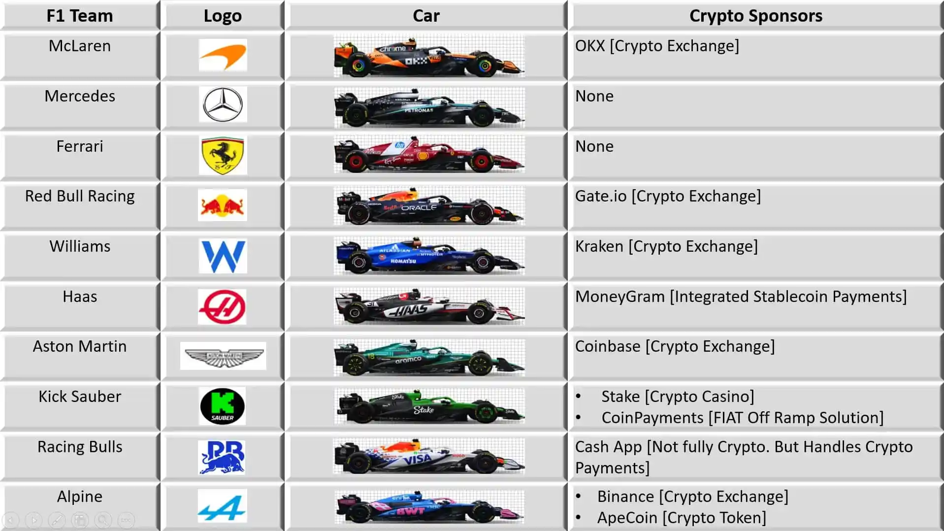 2025年F1车队与加密赞助商(来源:reddit)