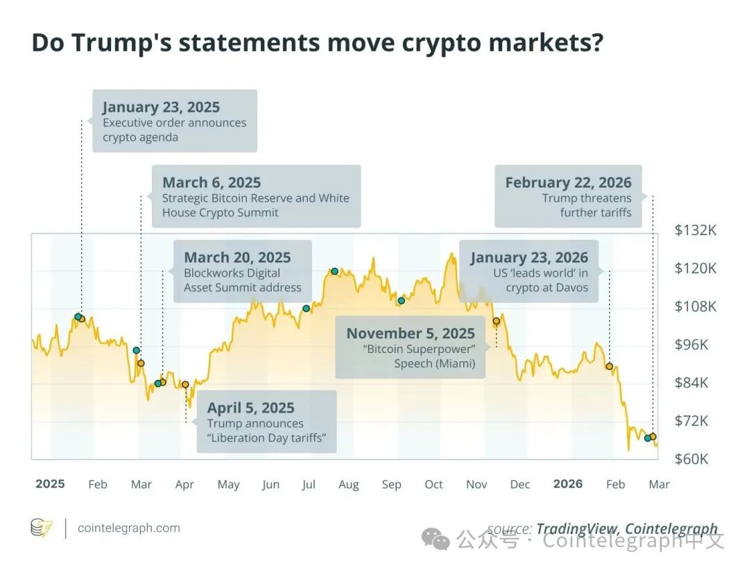 比特币对特朗普讲话反应冷淡,第二天微跌1.8%,一周后下跌1.5%。