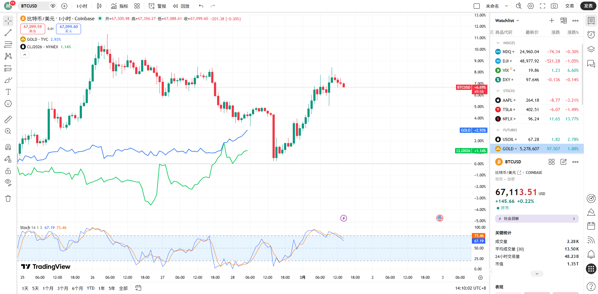 结合币安的现货与合约盘面数据(截至2026年3月1日14点),BTC/USDT 现价在67,392美元附近震荡整理。在如此重大的地缘危机爆发初期,BTC并未出现类似2020年“312”式的崩盘,而是顽强守住了67,000美元的关键支撑位。