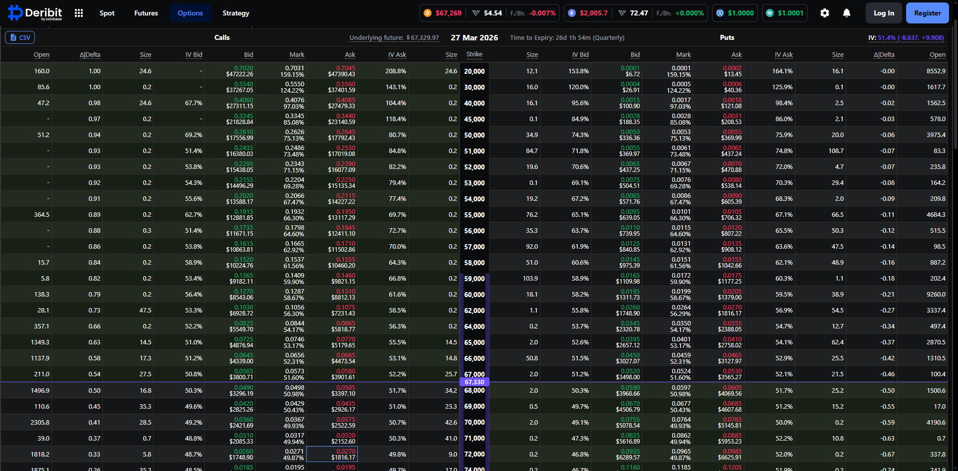 如果要透视聪明资金的真实意图,衍生品市场尤其是期权数据提供了最直观的量化截面。通过分析当前Deribit平台上即将于2026年3月27日到期的BTC期权数据,我们可以清晰地描绘出主力机构对未来一个月的路径推演。