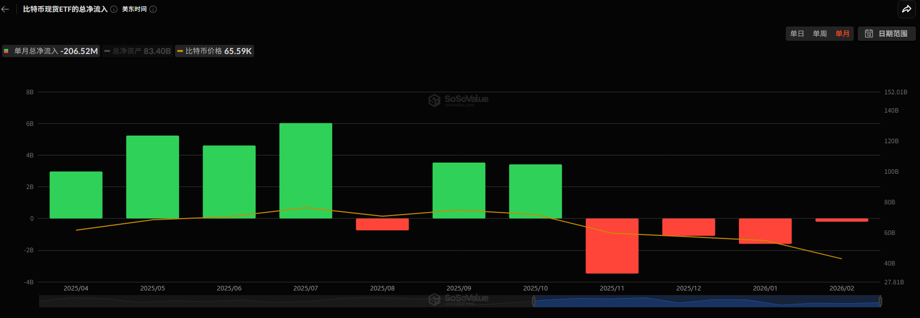 因此,比特币市场的牛市与熊市周期,价格的上涨或下跌,往往与华尔街比特币现货ETF资金的净流入和净流出情况高度相关!例如,自去年10月份比特币创下12.6万美元的历史高点以来,在短短四个月内,比特币的价格已遭遇腰斩,在撰写本文时,其价格在66,000美元附近徘徊。而这一价格下跌的主要表现形式,是伴随了连续四个月比特币现货ETF资金的净流出,净流出资金总额高达63.86亿美元。