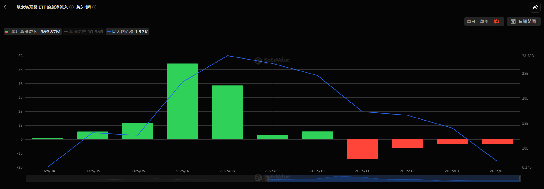 而在今年2026年,1月以太坊现货ETF的净流出资金为3.52亿美元。而与比特币现货ETF的情况不同的是,2月华尔街从以太坊现货ETF的净流出资金有所增加,达到了3.69亿美元,超过了1月资金的净流出规模。