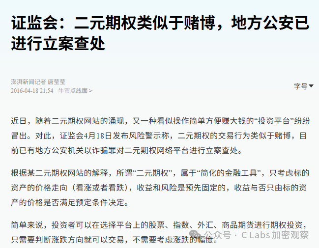 2016年,中国证监会发出严厉警告: 明确指出这类二元期权本质是非法网络赌博,公安机关可以诈骗罪立案查处。