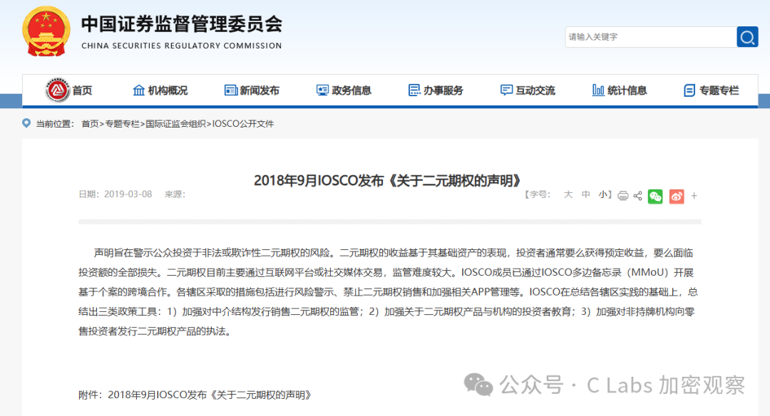 而且中国证监会还在2018年专门转发了国际证监会(IOSCO)的声明,警示公众投资于非法或欺诈性二元期权的风险。