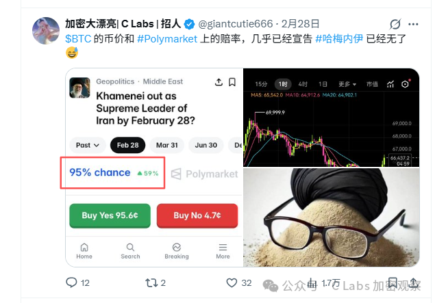 例如在最近对伊朗的袭击中,在川普确认哈梅内伊死亡之前,知名预测市场Polymarket就已经通过赔率向世界宣布,哈梅内伊已经无了: