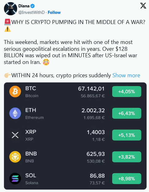 舆论风向迅速转变,从对“第三次世界大战”的担忧转向了可控的军事行动。随着最坏情况发生的可能性突然降低,风险偏好回升,加密货币市场也立即做出反应。