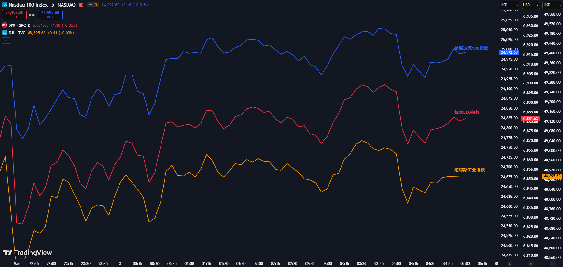 受周末冲突升级的消息影响,美股周一开盘时出现了恐慌性抛售,三大股指一度下跌超过1%。然而,随着交易的推进,避险情绪与技术性买盘展开了激烈的拉锯战,最终美股收盘表现好于预期。