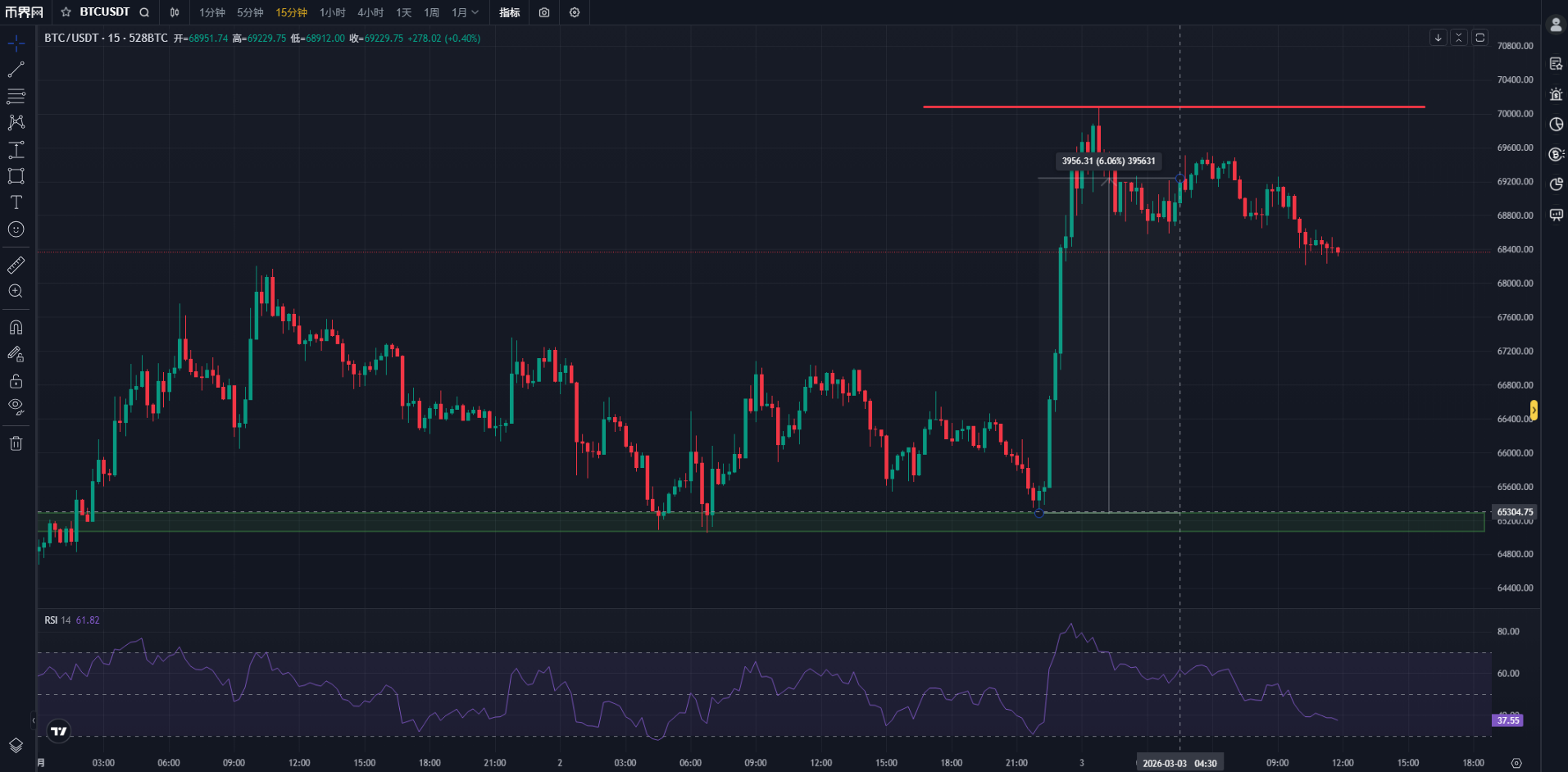 整体来看,在昨晚的美股交易时段,比特币价格上涨超过5%。美股收盘时,最终飙升6.06%,其价格甚至在短暂时刻突破了70,000美元这一短期内的关键心理阻力位。