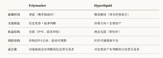 一句话总结:Polymarket 交易的是「这件事发生的概率」,Hyperliquid 交易的是「这件事发生之后的价格走势」。