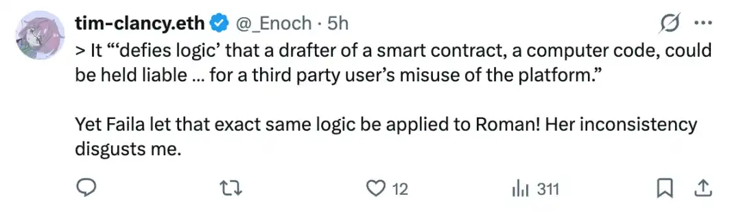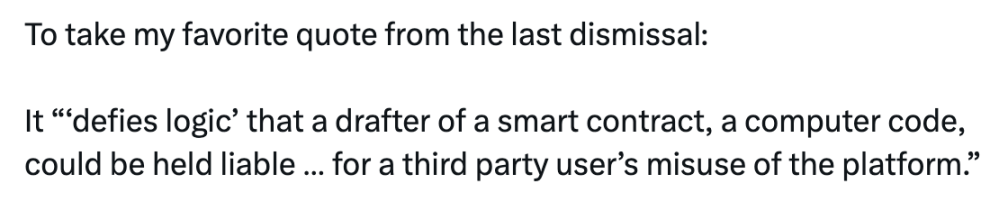 Brian Nistler 在推文中表示,引用上一份判决书的一句话来说,智能合约的起草者,竟然要为第三方用户滥用平台的行为承担责任,这简直「违背逻辑」。