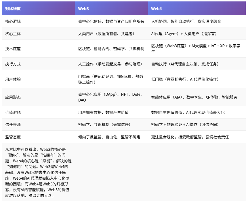 以下是Web3与Web4的核心差异对比,清晰呈现两者的本质不同: