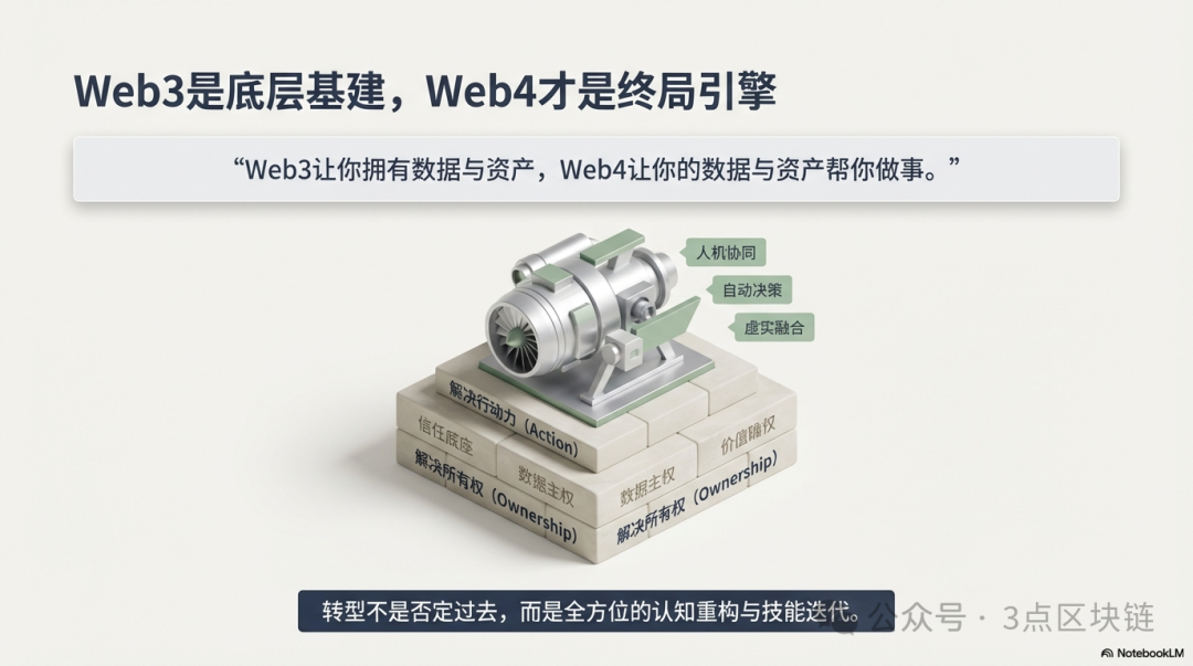 对Web3从业者而言,转型Web4,不是选择,而是生存——固守Web3的既有认知与技能,终将被时代淘汰;主动拥抱变化,完成认知破局、技能迭代、生态融入,才能在Web4时代立足。