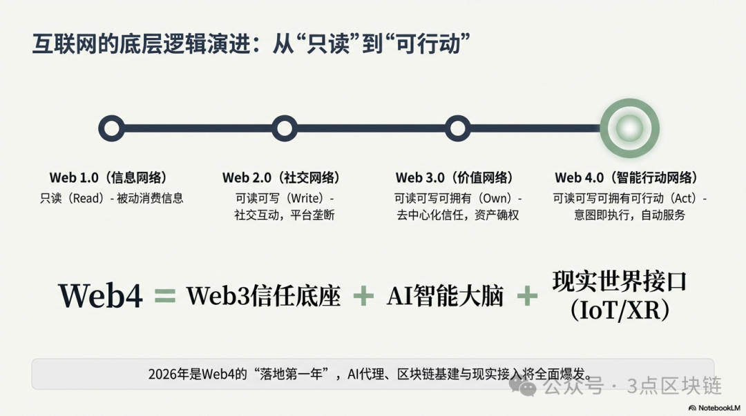 当Web3还在为“去中心化”的理想主义争论不休,为NFT、DeFi的泡沫褪去而迷茫挣扎时,Web4的浪潮已悄然席卷而来。从“可读可写可拥有”到“可读可写可拥有可行动”,互联网的进化从未停止,而这场进化,对每一位Web3从业者而言,不是选择题,而是生存题。