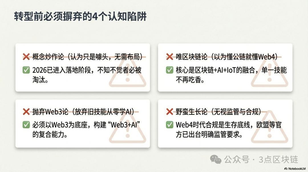 Web3从业者转型Web4,最容易陷入以下4个认知误区,这些误区会导致你方向跑偏、努力白费,甚至被时代淘汰,一定要及时规避:
