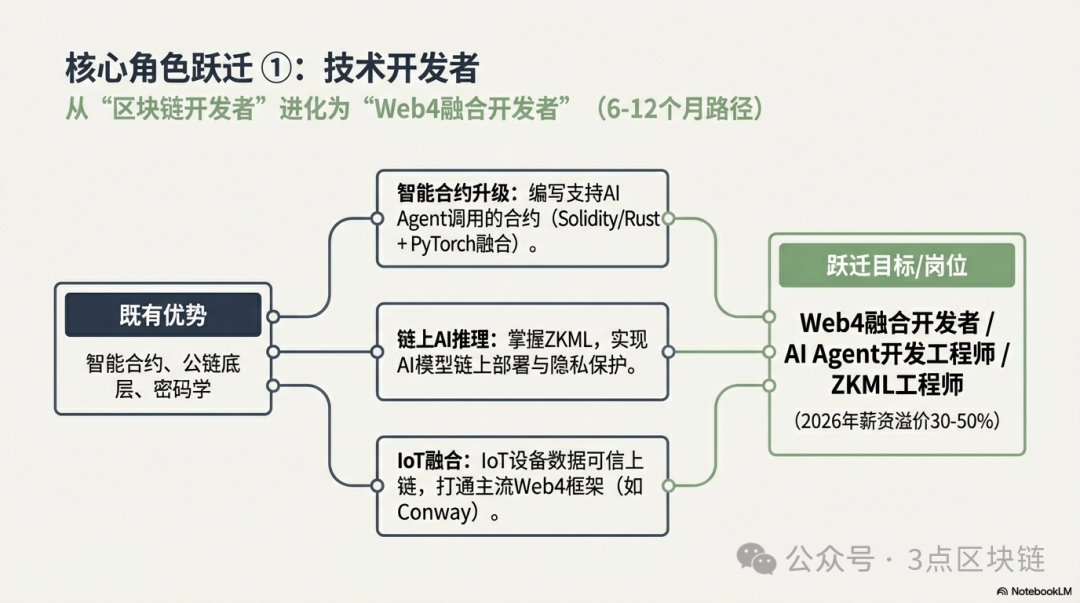 规避方法:以Web3为基础,拥抱Web4的新变化。Web3的技能是你的核心优势,转型的核心是“补充新技能、融合旧技能”,而不是“放弃旧技能、从零开始”。比如,智能合约开发者,在巩固区块链技能的基础上,补充AI代理开发、ZKML等技能,形成“区块链+AI”的复合能力,这才是Web4时代的核心竞争力。