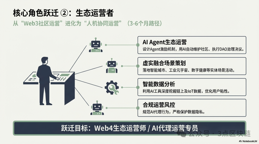 岗位转型方向:Web4生态运营师、AI代理运营专员、虚实场景运营师、Web4社区运营专家,这些岗位需求将随着Web4应用的落地快速增长,核心竞争力在于“懂Web3生态+懂AI运营+懂合规”。