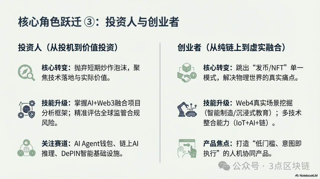 投资转型方向:Web4价值投资人、AI+Web3赛道投资人、Web4基础设施投资人,核心竞争力在于“技术判断力+场景洞察力+合规意识”,避免追逐短期泡沫,聚焦长期价值。
