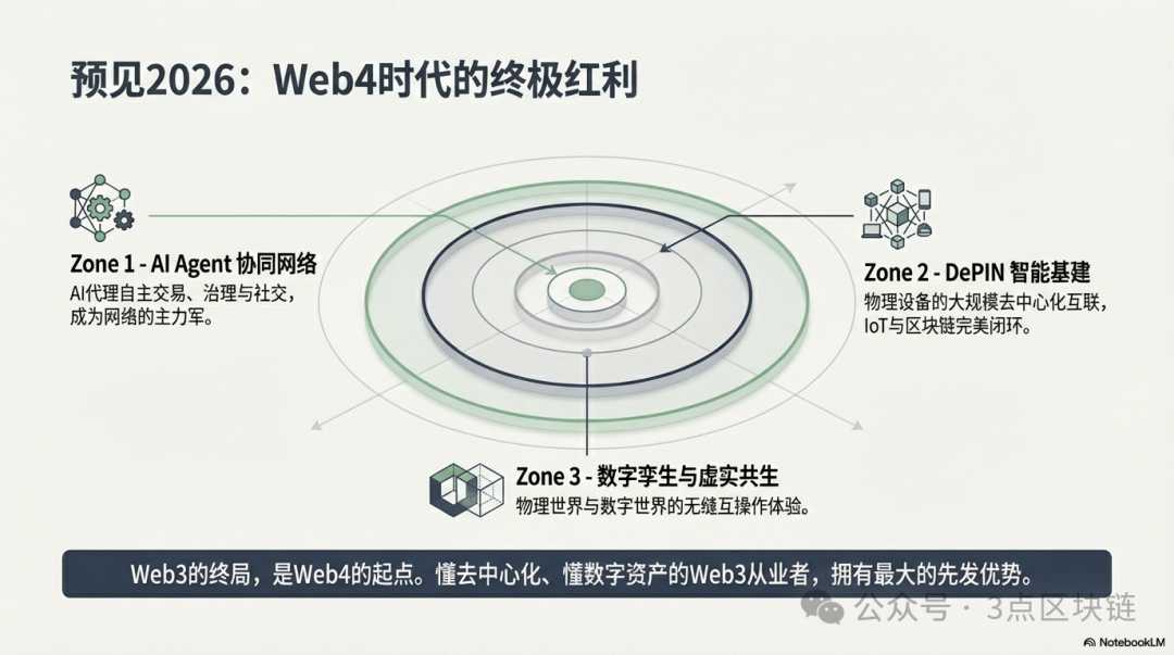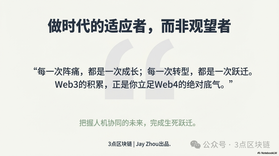 Web3的终局,是Web4的起点;Web3的积累,是Web4的底气。愿每一位Web3从业者,都能抓住Web4的机遇,完成转型跃迁,在人机协同、虚实共生的Web4时代,实现自己的价值,守住自己的竞争力,成为时代的适应者,而非观望者。