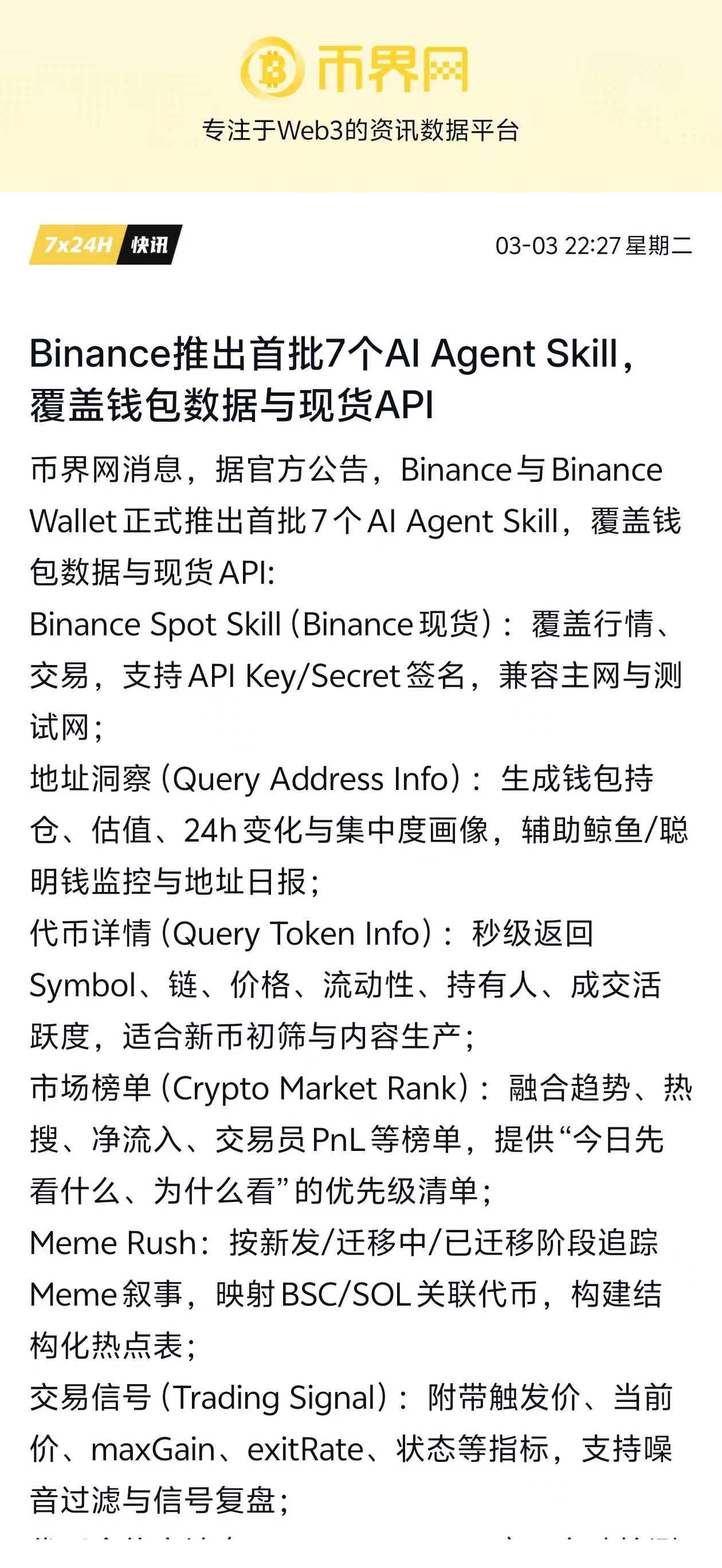 AI Agent Skills 革命:2026年3月,Binance 发布了 7 项核心 AI 代理技能。通过 API Key 授权,第三方 AI 代理可以获得 Binance 级别的订单簿深度查询、复杂 OCO 订单执行以及链上地址风险分析能力。