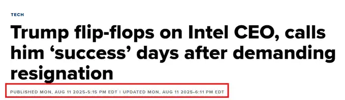 例如,看看 2025 年 8 月 11 日的一条新闻。当时特朗普总统与英特尔 CEO 陈立武(Lip-Bu Tan)会面。就在几天之前,特朗普在 Truth Social 上发文称,陈立武「存在严重利益冲突,必须立即辞职,没有其他解决办法」。