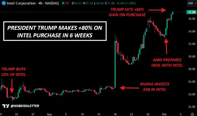 几天后,特朗普政府宣布,已与英特尔达成一项「协议」,将收购该公司 10% 的股份。正如下文所示,这笔投资在不到两个月的时间里便获得了超过 80% 的收益。