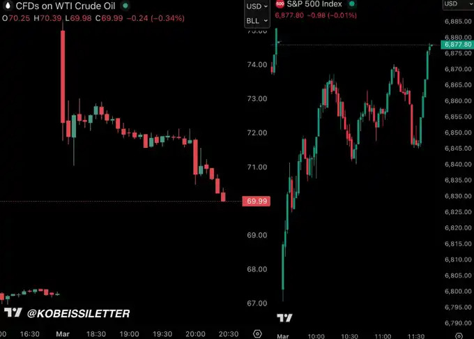 WTI 原油价格一度回吐了约 70% 的涨幅,而标普 500 指数昨日甚至一度转为上涨。不过今天,这一走势再次被逆转——油价再创新高,而股市则刷新阶段低点。