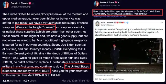正如 3 月 2 日的表态所显示的那样,特朗普现在表示,「战争可以永远打下去」,并称美国拥有「无限量的中高端武器」。