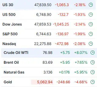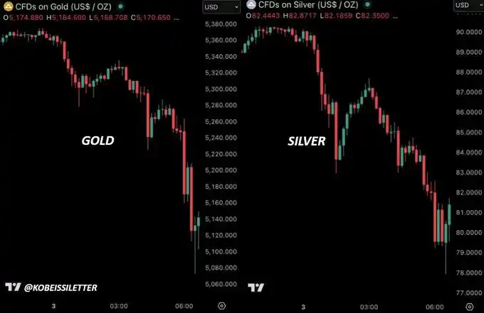 这一点在当前白银和黄金的价格走势中已经有所体现。两种金属都出现了明显下跌,其中白银在 24 小时内已下跌约 20%,即便市场整体仍在为风险溢价重新定价。