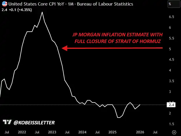 根据摩根大通(JP Morgan)的估算,如果霍尔木兹海峡被关闭,油价可能升至 每桶 120–130 美元。这将意味着美国 CPI 通胀率可能升至约 5%。