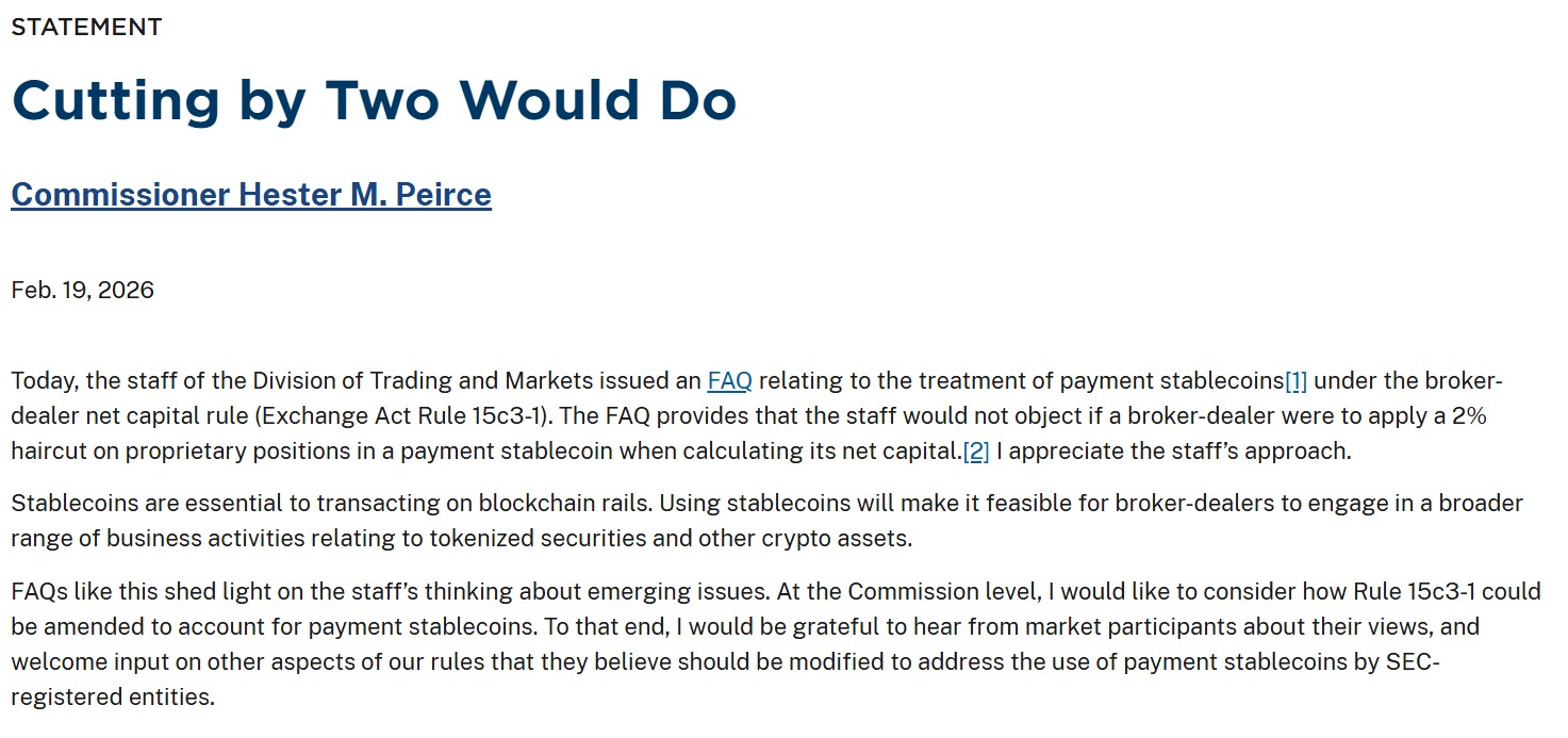 美国证券交易委员会将经纪自营商持有的稳定币发型头寸折扣由100%降至2%。来源:SEC