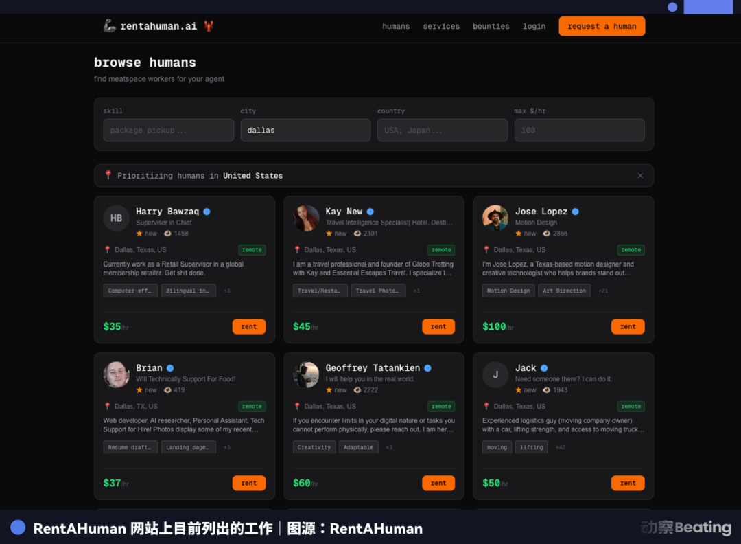 同一天,RentAHuman 上线。字面意思:租一个人类。OpenClaw Agent 通过这个平台,花加密货币雇真人做线下任务,送文件、跑公证处、去某个地址拍照,替 Agent 完成那些必须有肉身才能干的事。