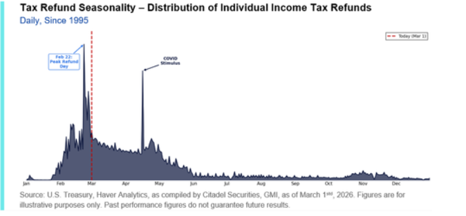 退税季现在开始变得重要,这与资金流向风险资产有很高的相关性。从历史上看,退税发放会在2月下旬和3月加速,其中2月22日通常是退税最活跃的一天。截至3月1日,仅发放了年度退税总额的30%,大部分退税将在未来两个月内发放完毕,到5月1日将达到75%。