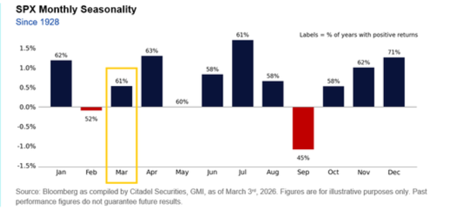 2026年迄今的季节性表现与历史常态高度一致。自1928年以来,3月份通常是一个小幅上涨的市场(61%的概率录得正收益,平均涨幅约53个基点),随后将进入4月份,历史上表现第二好的月份。
