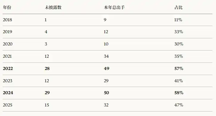 早期(2018–2021年)未披露率维持在 11%–35% 之间;