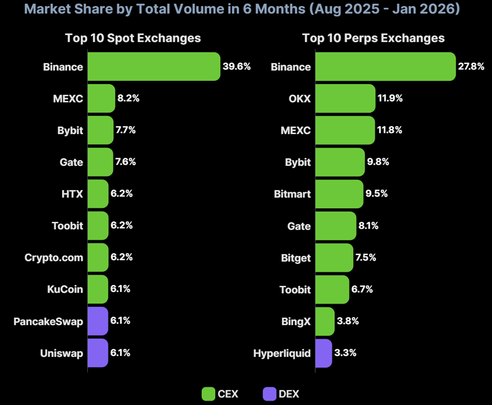 根据 CoinGecko 发布的《2026 年 CEX & DEX 交易活动报告》,2025 年,中心化交易所仅现货和永续合约交易量就接近 80 万亿美元。这一数字凸显了 CEX 的持续主导地位,但 DEX 的渗透速度同样在加快。