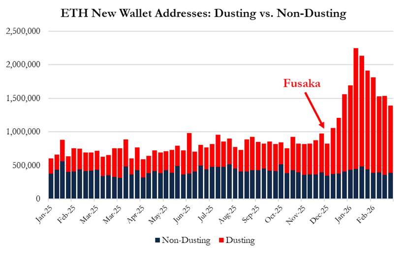 此前,华尔街策略师 Tom Lee 曾将以太坊活跃地址增长视为基本面强化信号。但Culper认为,部分链上数据可能存在“虚假繁荣”。报告称,在Gas费用大幅下降后,大量低成本交易涌入网络,其中包括地址投毒以及钱包灰尘攻击等行为。