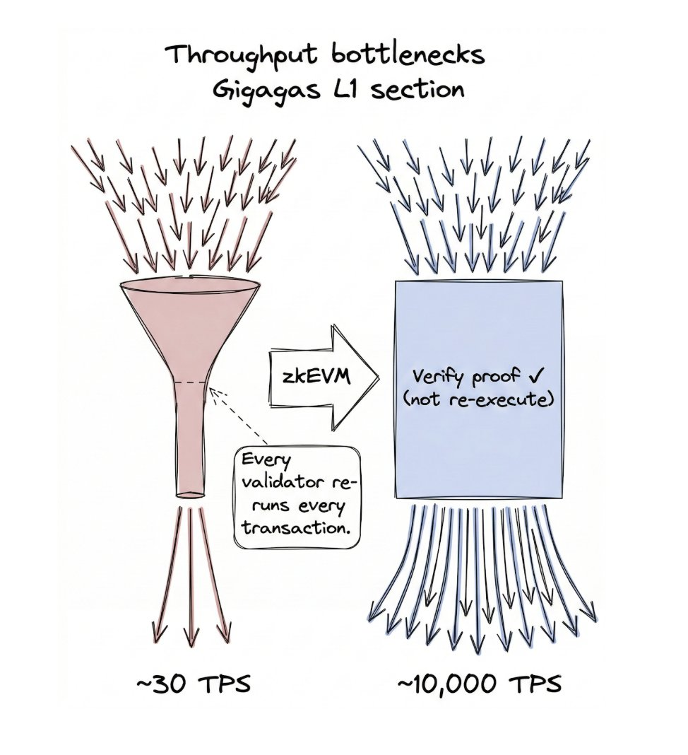 解决方案:Strawmap 目标是每秒 1 gigagas 的执行容量,对于典型交易换算成约每秒 1 万笔(具体数字取决于每笔交易的复杂程度,不同操作消耗不同量的 gas)。核心技术是「零知识证明」(ZK 证明)。