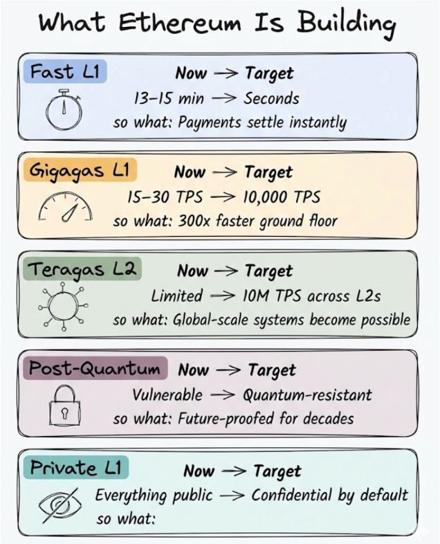 路线图围绕五个目标组织一切。以太坊已经在运作,每天有数十亿美元在其中流转。但它在可构建的东西上有真实的限制。这五个目标就是要消除这些限制。
