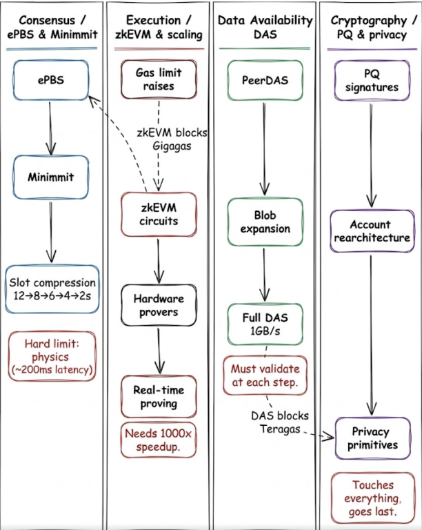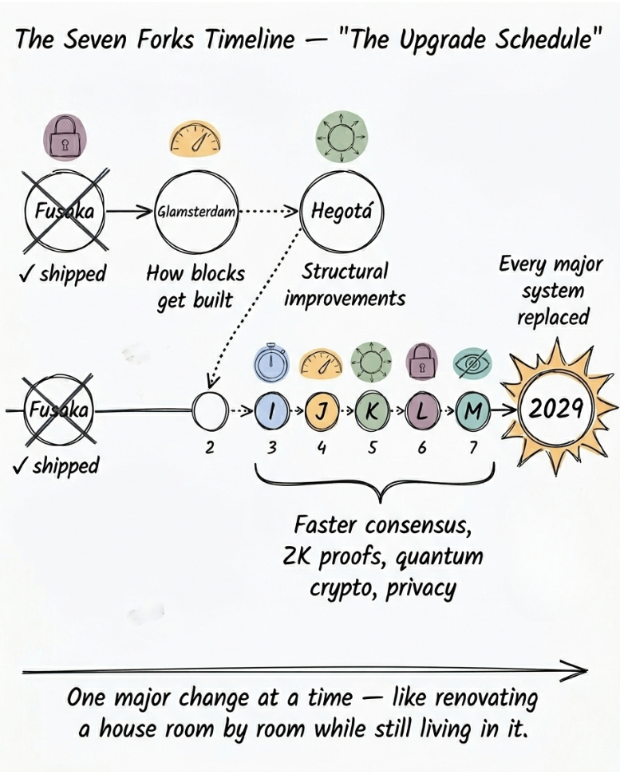 Hegotá随后带来进一步的结构性改进。剩余的分叉(I 到 M)延伸至 2029 年,逐步推出更快的共识、ZK 证明、扩展的数据可用性、量子抗性密码学和隐私功能。