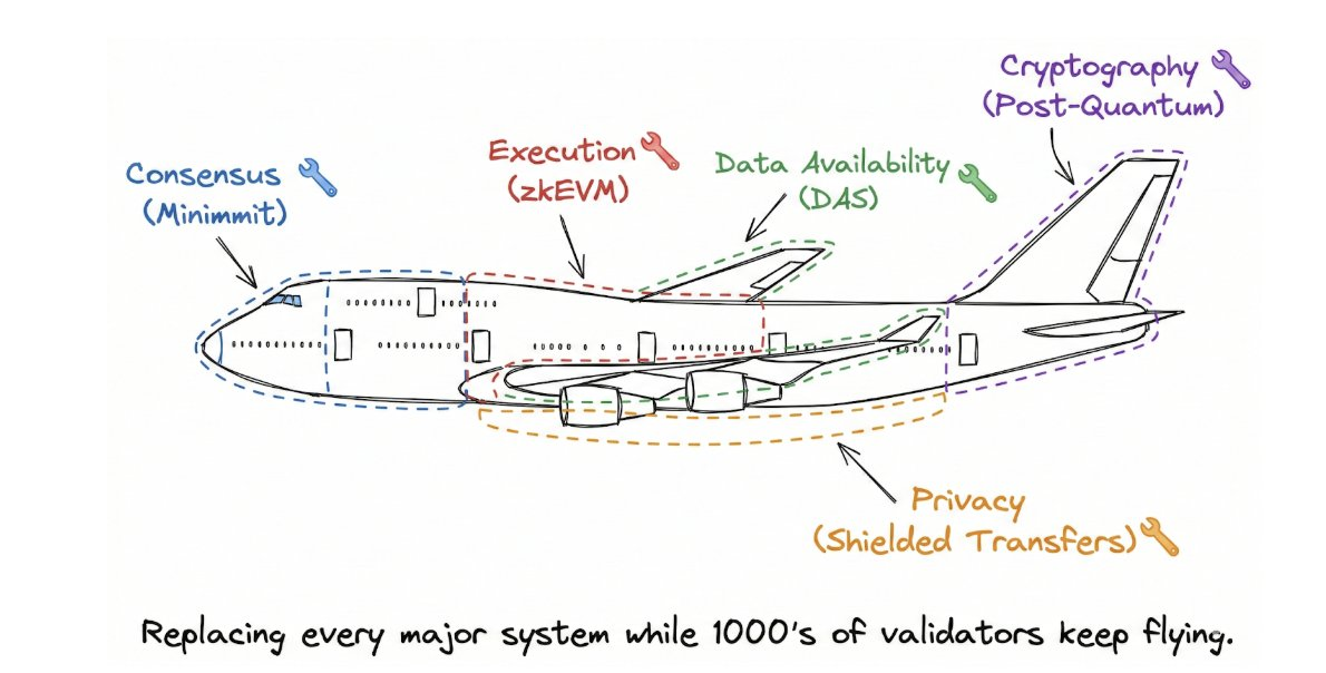 到 2029 年,系统的每个主要部件都将被替换。但全程没有计划中的「停机大改写」。目标是向后兼容的升级,在换木板的同时保持链的运行——尽管每次升级仍然需要节点运营者更新软件,边缘情况也可能发生变化。这是一次伪装成渐进升级的完整重建。严格来说,虽然共识层和执行层的逻辑都在被重建,但状态(用户余额、合约存储和历史记录)在所有分叉中都得到保留。「这艘船在载着货物的同时被重建。」大家上船吧!