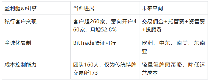 研究发现,当前营收的99.4%来自低毛利OTC交易(Over-the-Counter,场外交易)业务,毛利率仅0.128%,但这一数据并不代表公司的未来。2025年下半年启动的私行级管家战略已初见成效——私行客户超260家、意向开户超460家、月复合增长率52.8%,日本BitTrade并表贡献3.6亿港元,为全球化布局奠定基础。公司设定的盈利目标——2026年底实现单月盈利、2027年全面盈利能否实现,取决于客户变现能力与轻量化出海战略的执行效率。