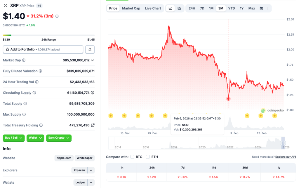 XRP 价格在 2026 年 2 月 6 日一度跌至 1.19 美元的低点,目前似乎在 1.15 美元至 1.20 美元区间内获得支撑。尽管自 2025 年创下 3.65 美元的历史高点以来,价格出现了明显回落,但该资产仍维持在 1 美元附近。