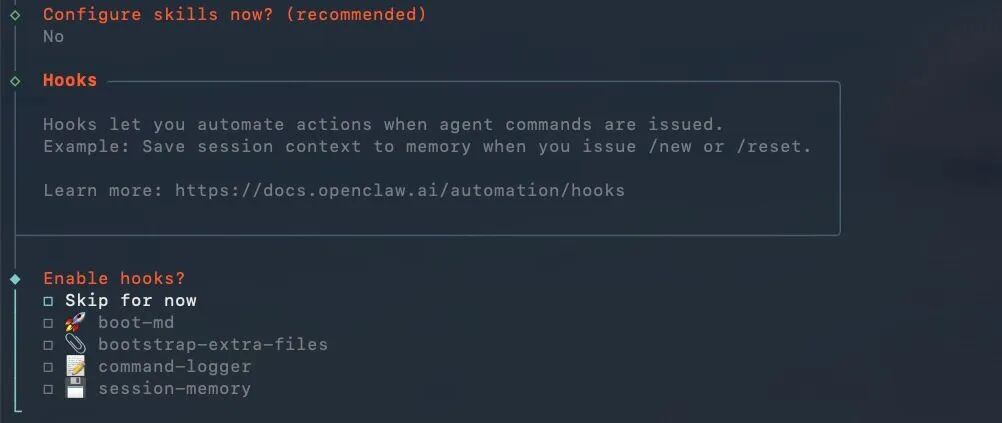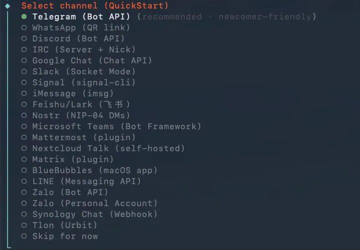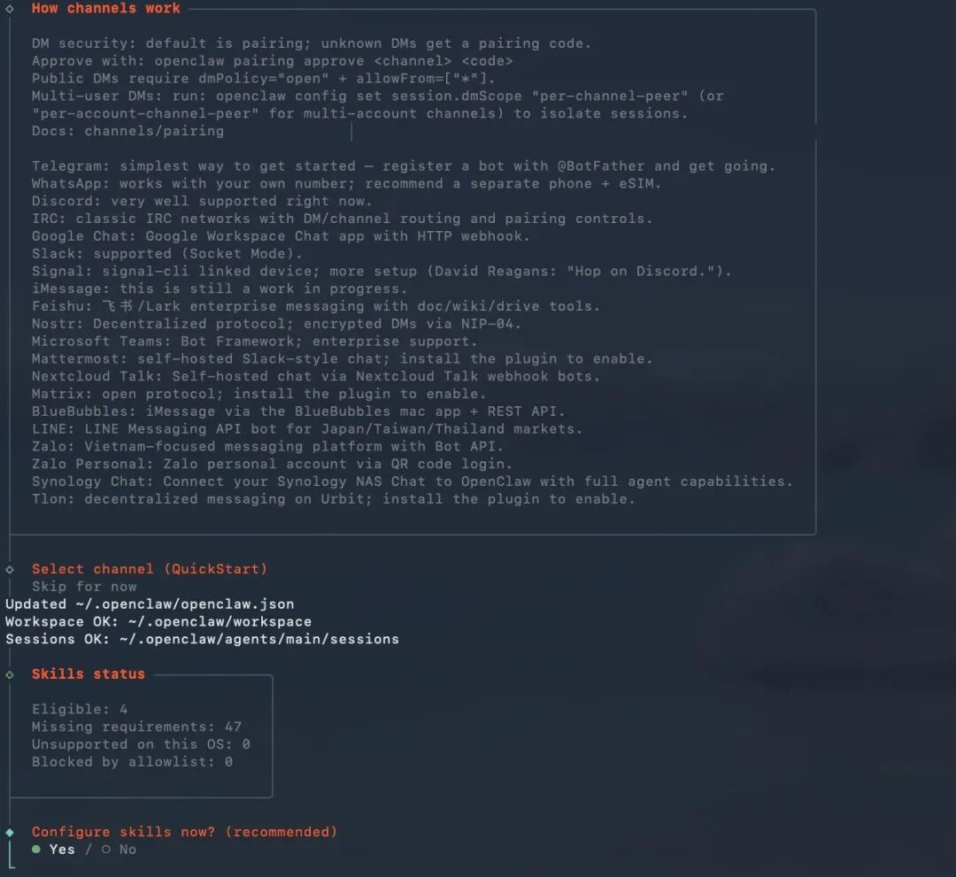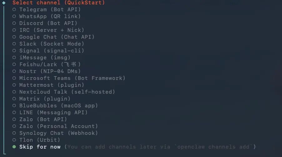 接下来 OpenClaw 会问你要不要配置飞书之类的消息通知渠道:可以先跳过。