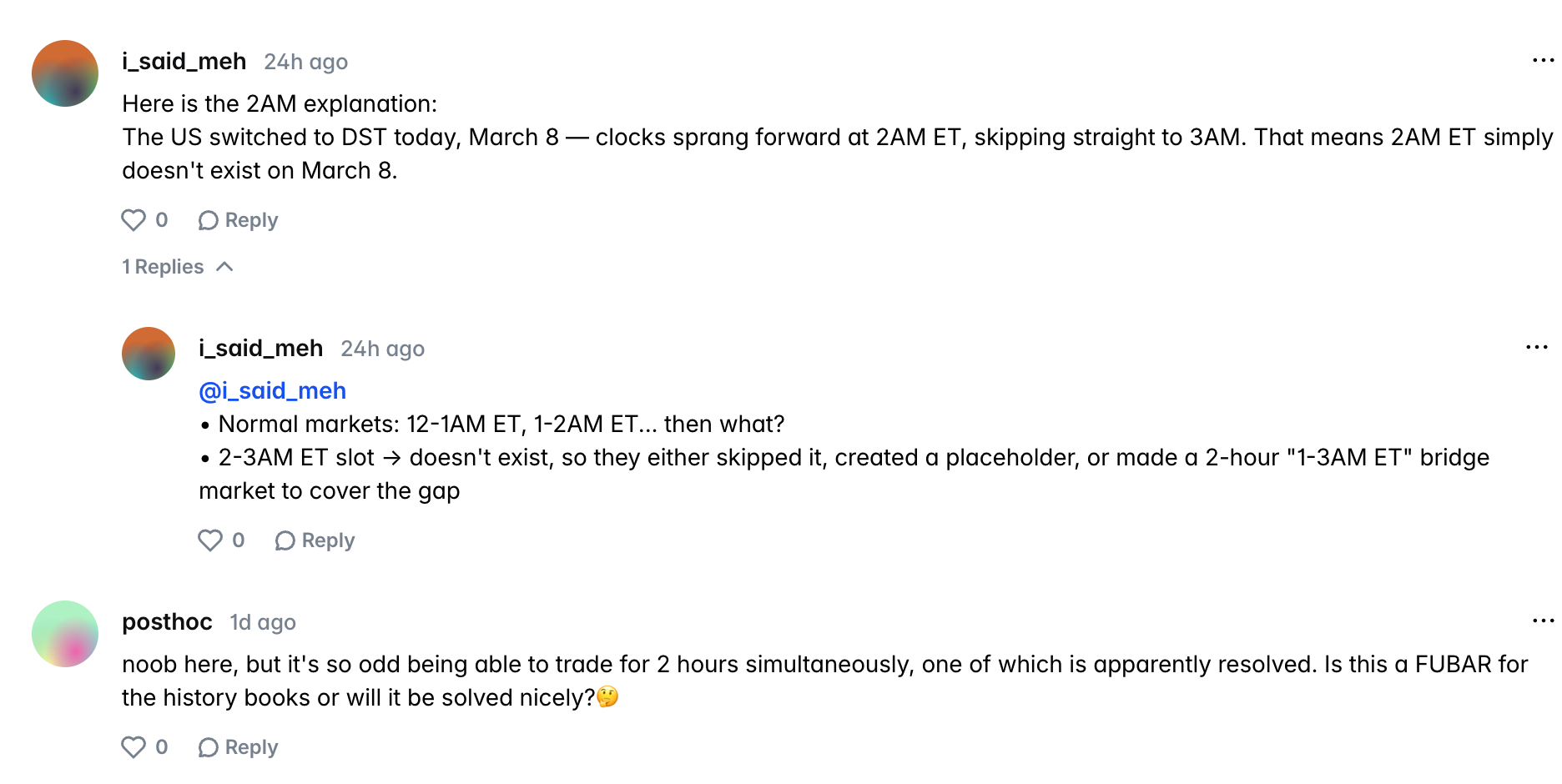 However, because the end time of this batch of events coincided with the change of daylight saving time, Eastern Time jumped directly to 3:00 the moment it reached 2:00 (i.e., the time period from 2:00 to 3:00 was skipped), which caused some confusion in the timing of this batch of events on the Polymarket platform itself.