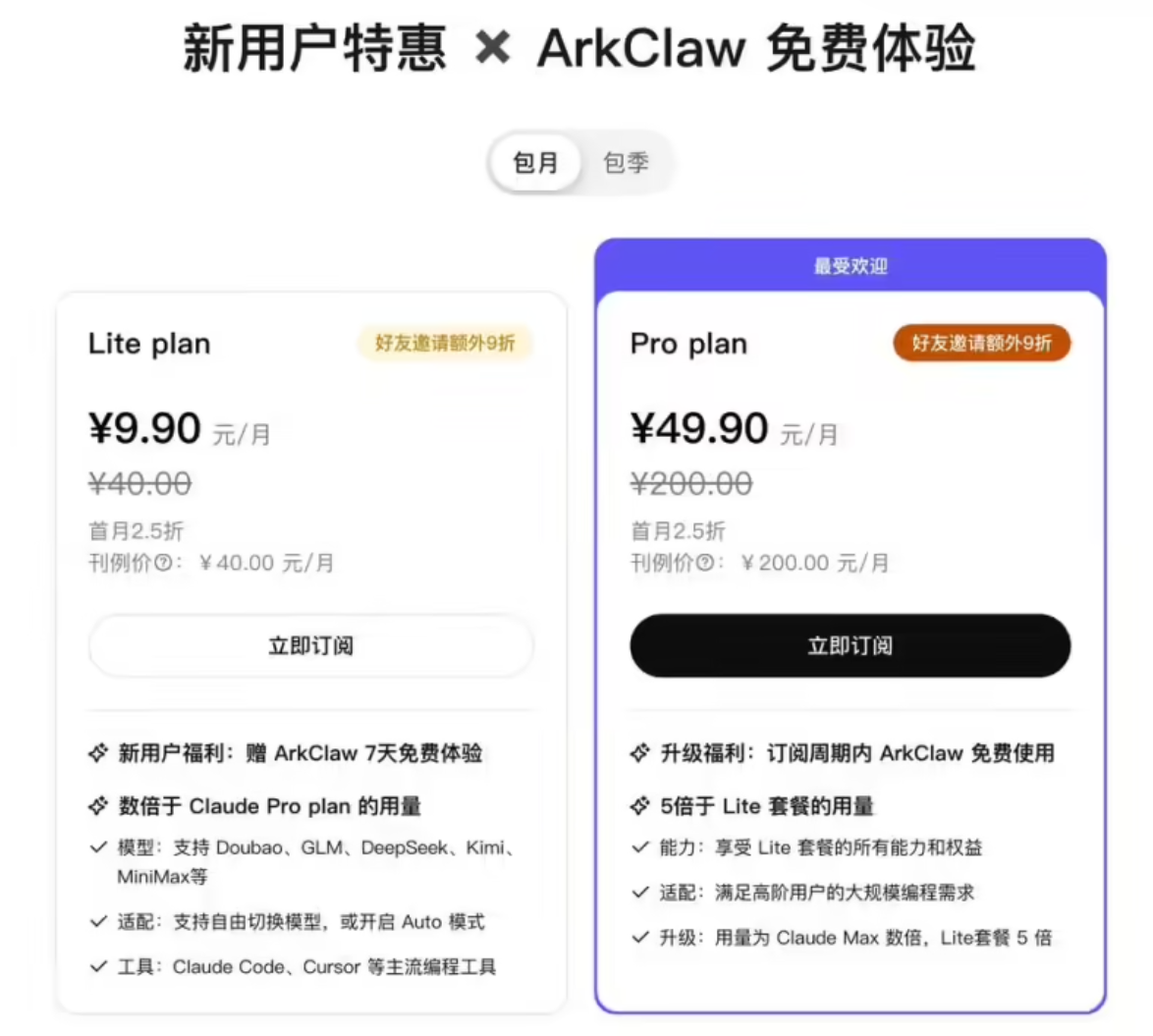 ArkClaw无需任何复杂配置,打开网页即可使用,7×24小时在线。当前,"火山方舟Coding Plan"用户可抢先体验,"Coding Plan Pro"用户登录即可同步使用,"Coding Plan Lite"用户可免费体验7天。