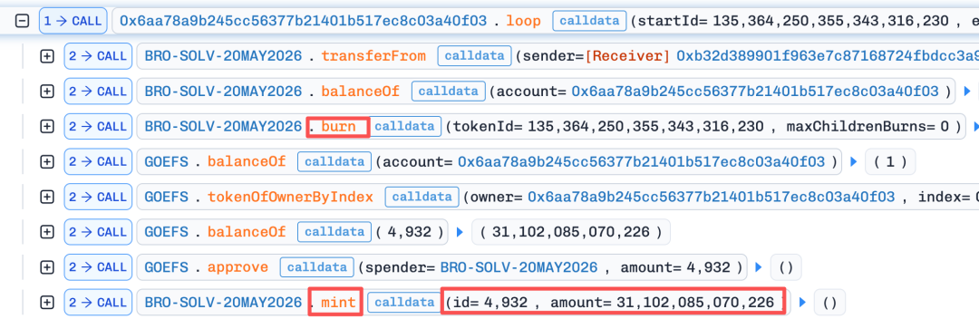3. 然后通过mint(4932, fullAmout),触发amount_ == sftBalance执行分支,实现攻击