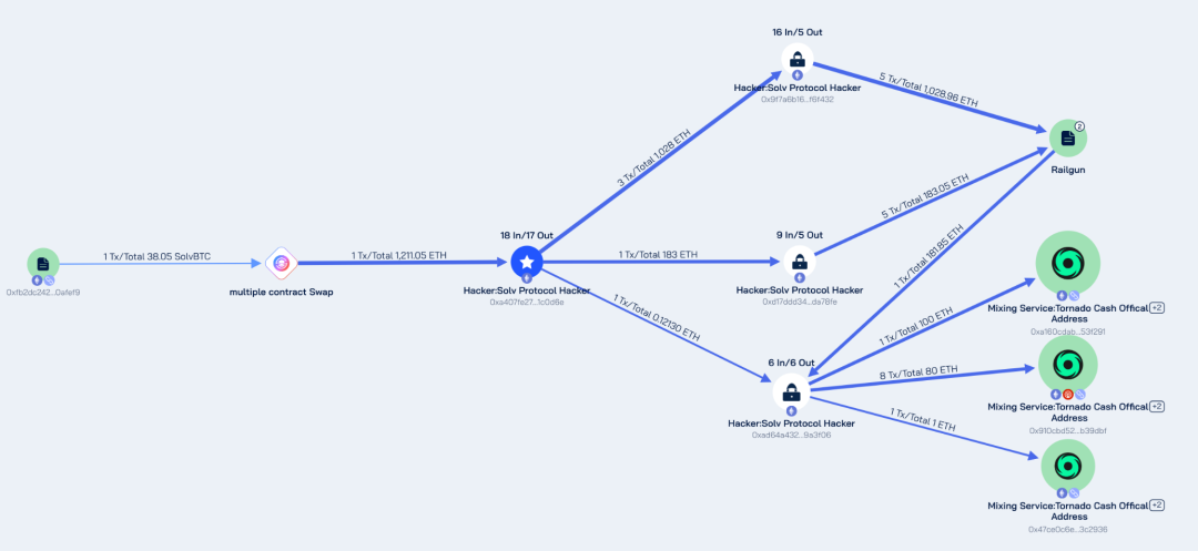 攻击者通过22次上述的操作,成功从合约中提取38 SolvBTC并兑换成 1,211.05 ETH。